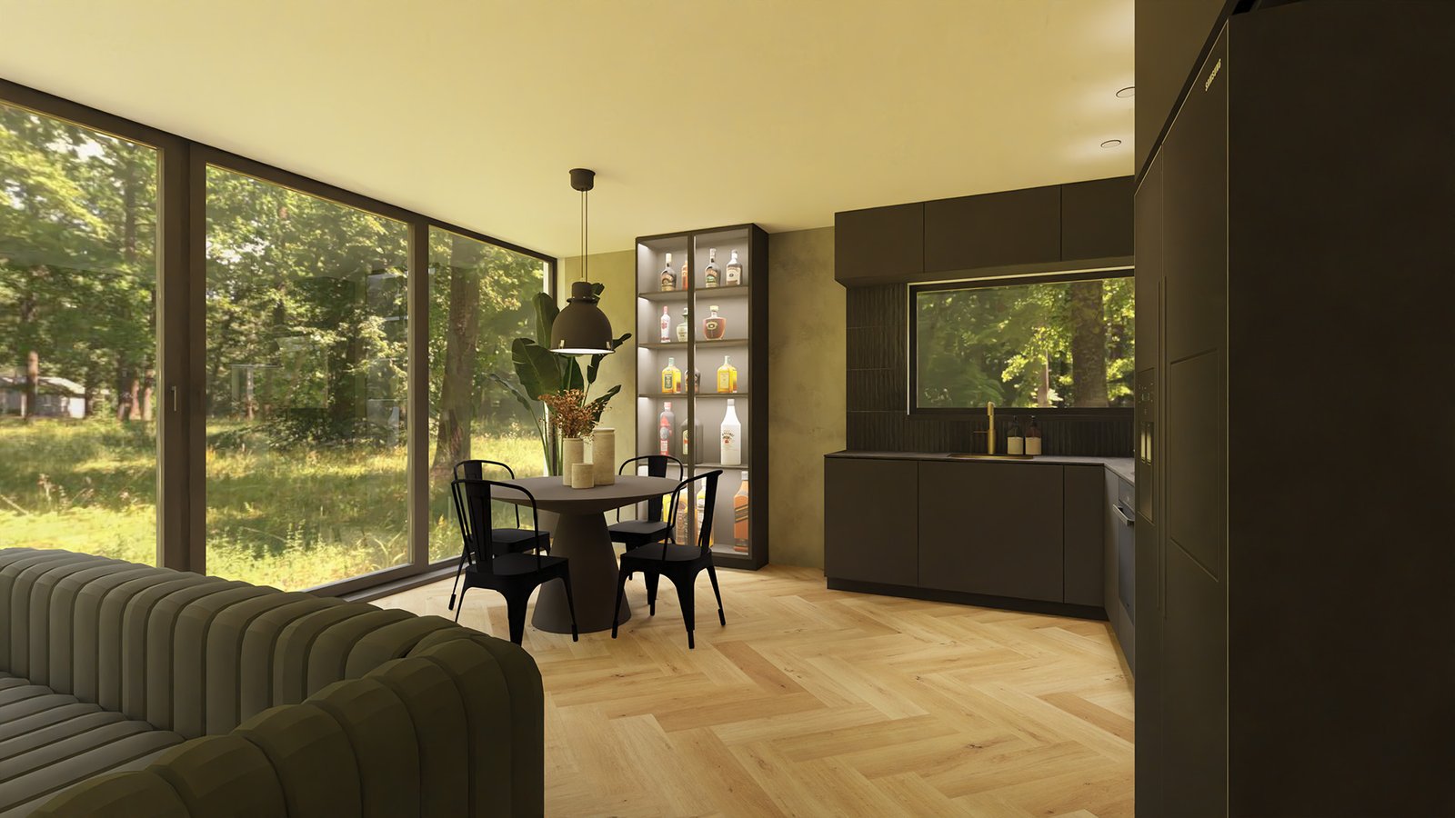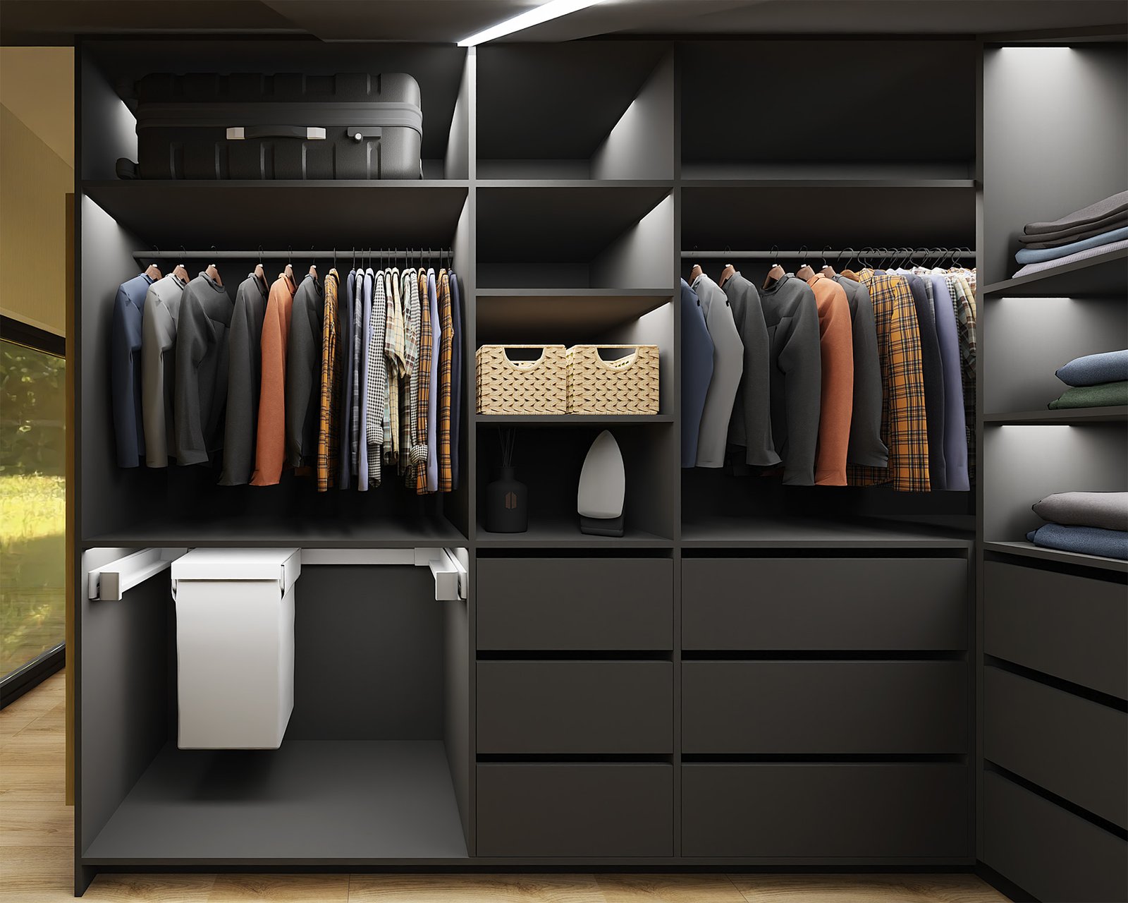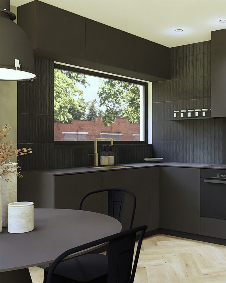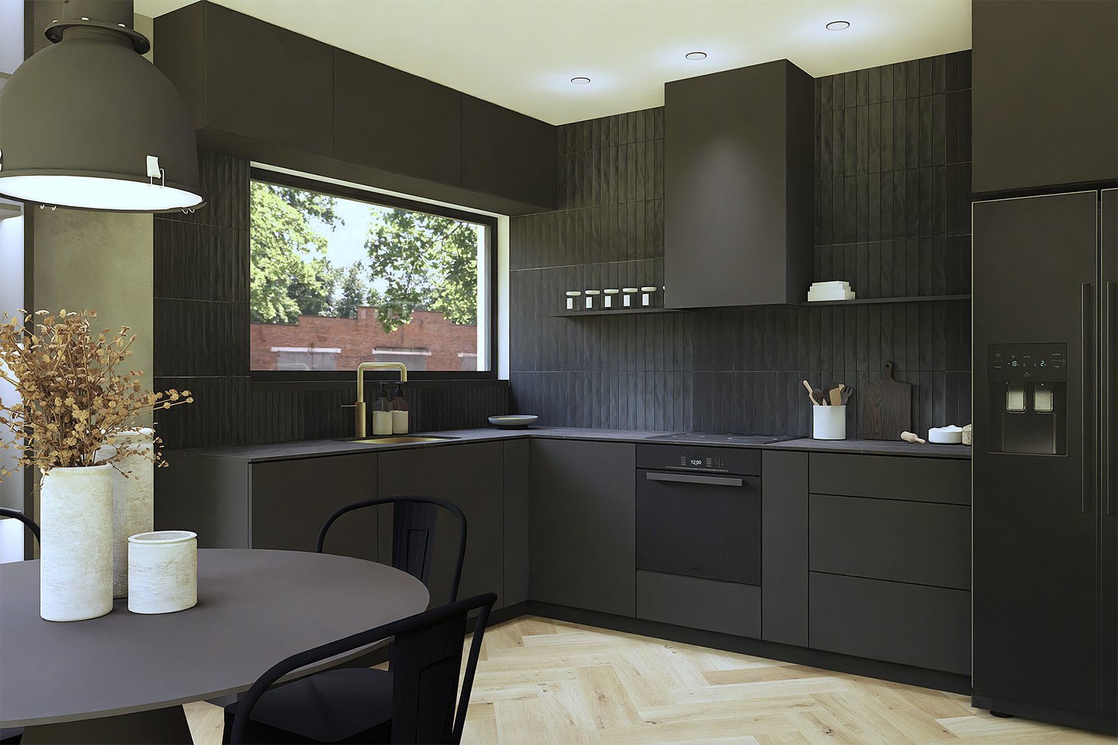 Ciemny, industrialny projekt z charakterem — dla singla, który wie, czego chce. Kuchnia z pot fillerem i blatem o strukturze łupka, ukryta spiżarnia w stylu colour drenching, garderoba z czarnym sufitem i przemyślanymi detalami. Surowość materiałów spotyka się tu z funkcjonalnością i klasą.