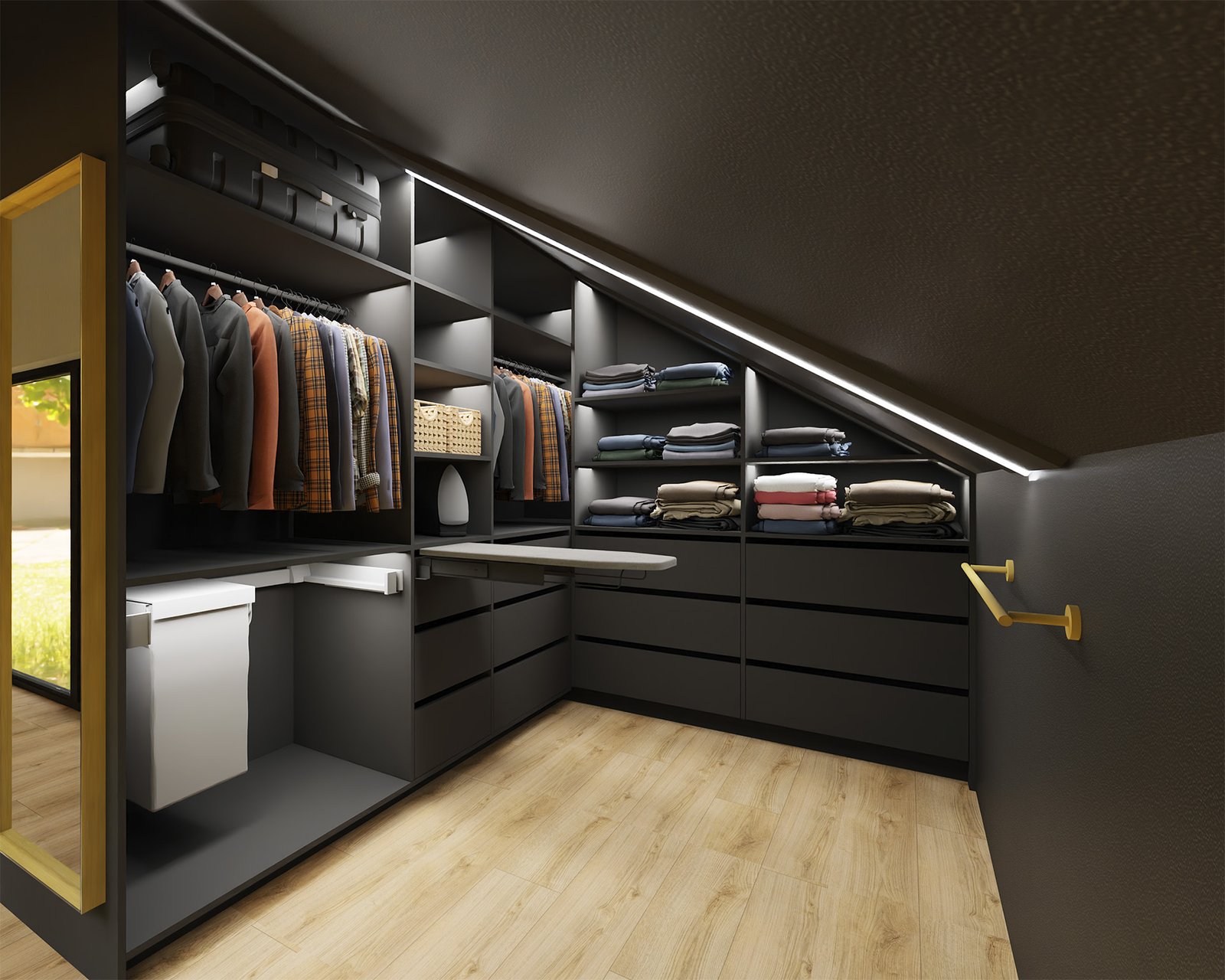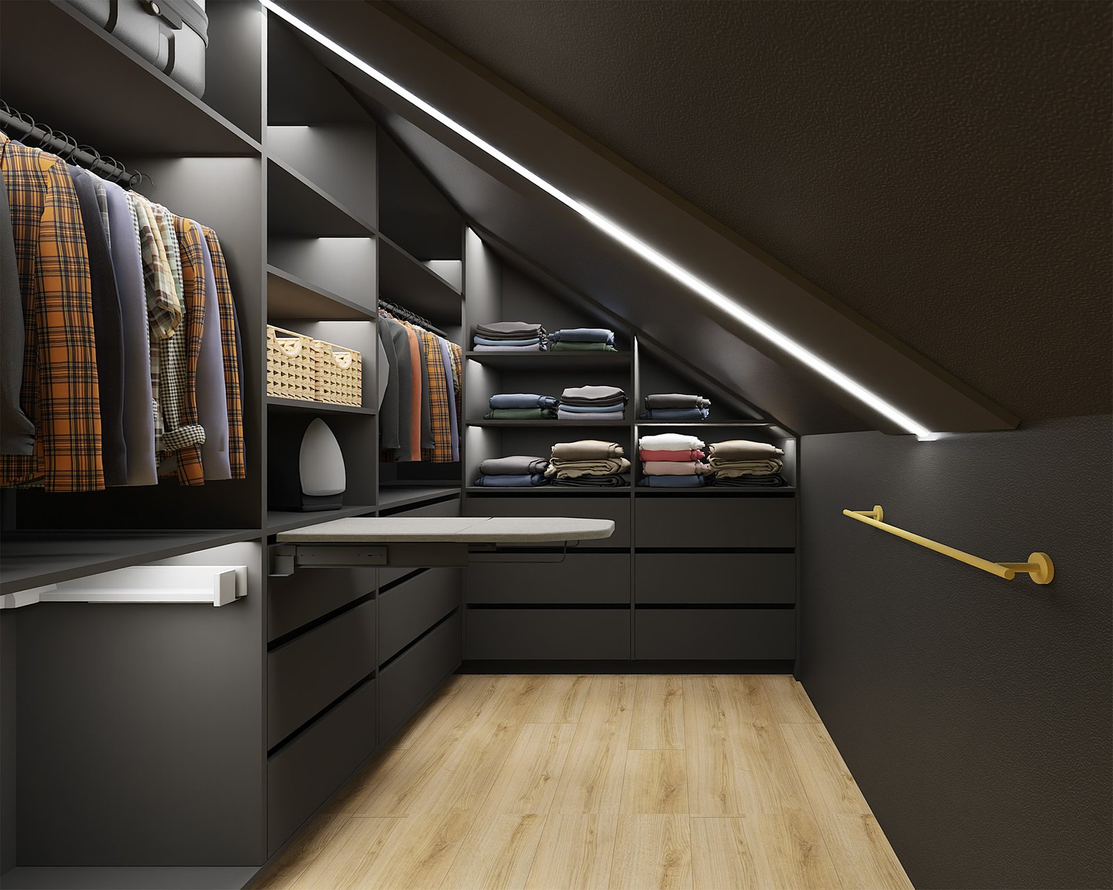 Garderoba to również colour drenching z czarnym sufitem, zabudową w kształcie litery L, podświetleniami LED, lustrem, wysuwanym koszem na pranie i składaną deską do prasowania. Zaproponowałam też lustro na zawiasach, które umożliwia obejrzenie całej sylwetki mimo skosów i ograniczonego światła dziennego.