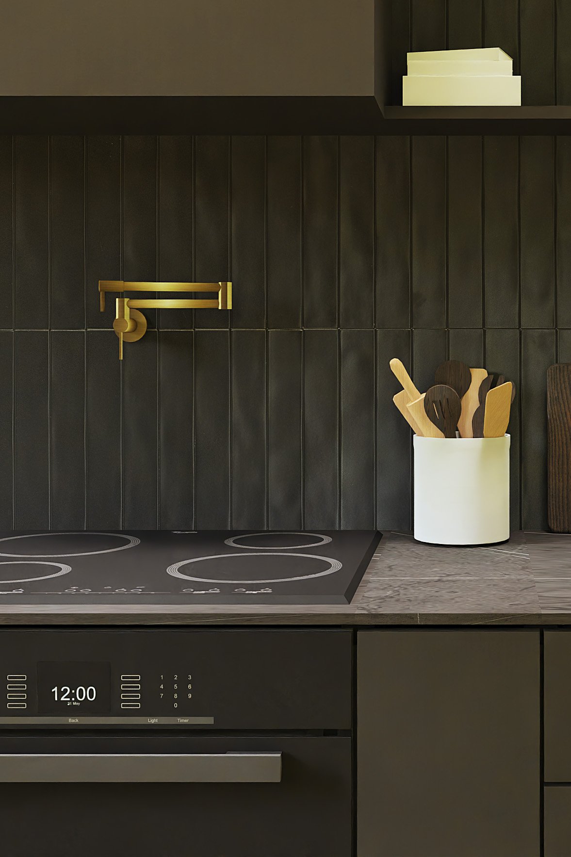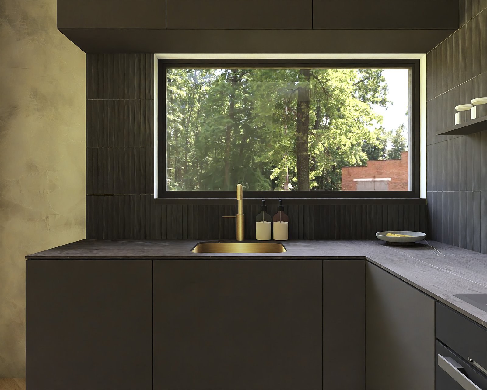 W kuchni króluje antracyt — gładkie fronty tip-on, blat o strukturze łupka i legendarne płytki z Ragno, które nadają przestrzeni głębi i trójwymiarowości. Mosiężne detale, takie jak zlew, wylewka i pot filler nad płytą, przełamują ciemną kolorystykę i dodają szlachetnego kontrastu. Na podłodze — naturalna dębowa deska, która ociepla całość. Kuchnia kryje też kilka ukrytych rozwiązań: otwieranie szafki zlewowej na dotyk kolana (servo uno) i podświetlenia LED.