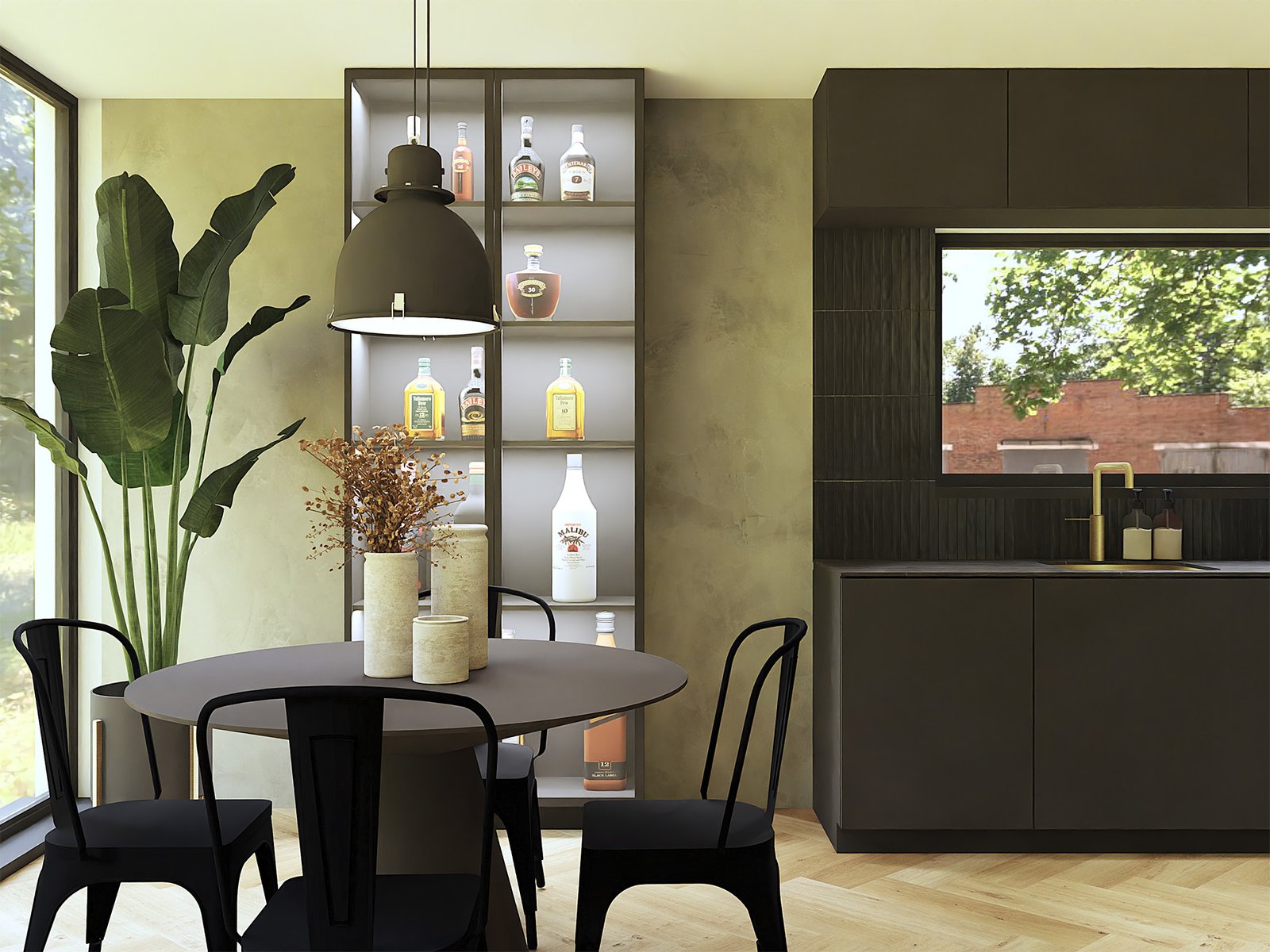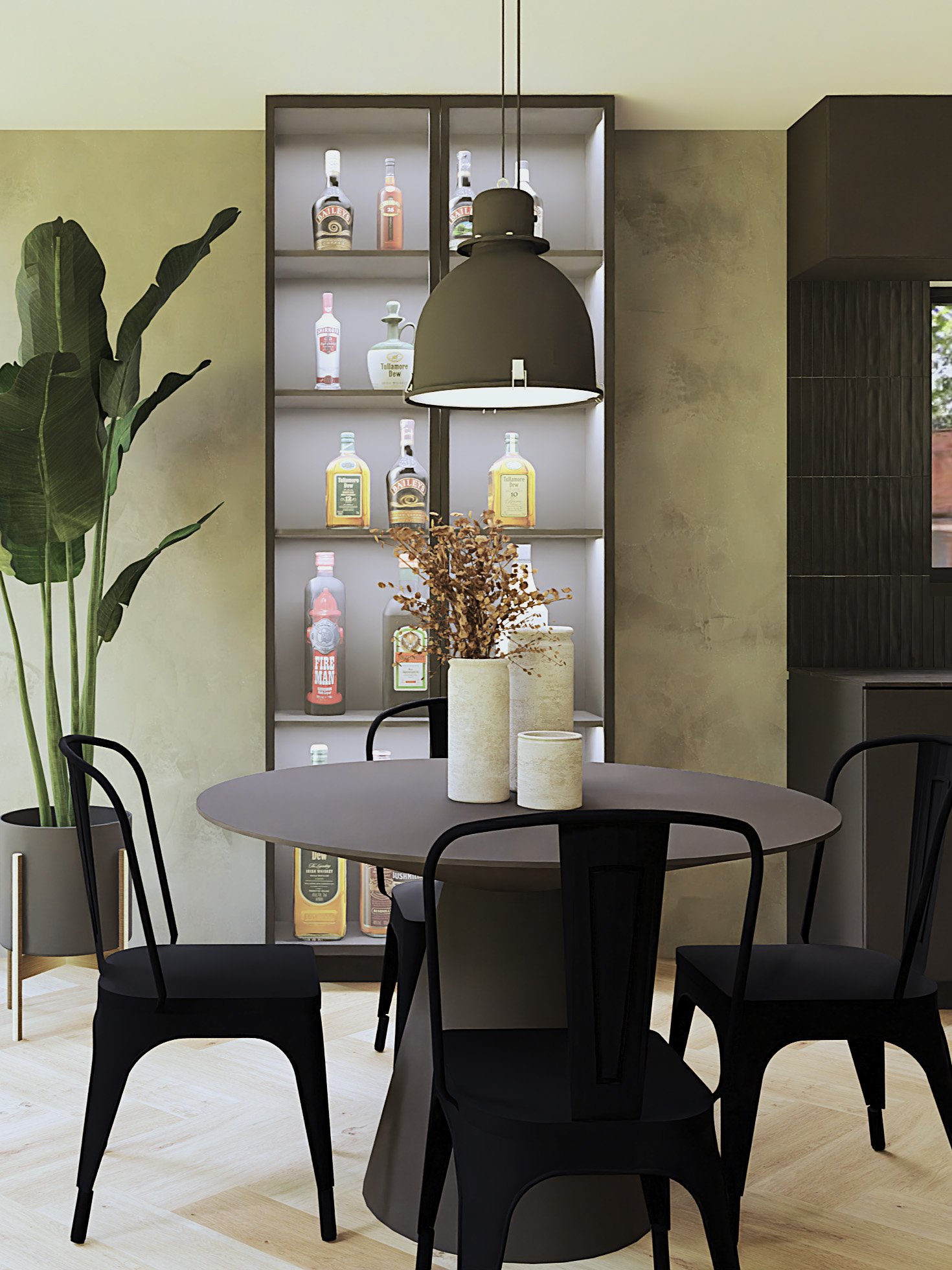 Jadalnia została oddzielona wizualnie wapienną farbą na ścianie. Zaprojektowana witryna z podświetleniem LED eksponuje kolekcję alkoholi klienta, który uwielbia gotować i organizować kolacje dla przyjaciół.
