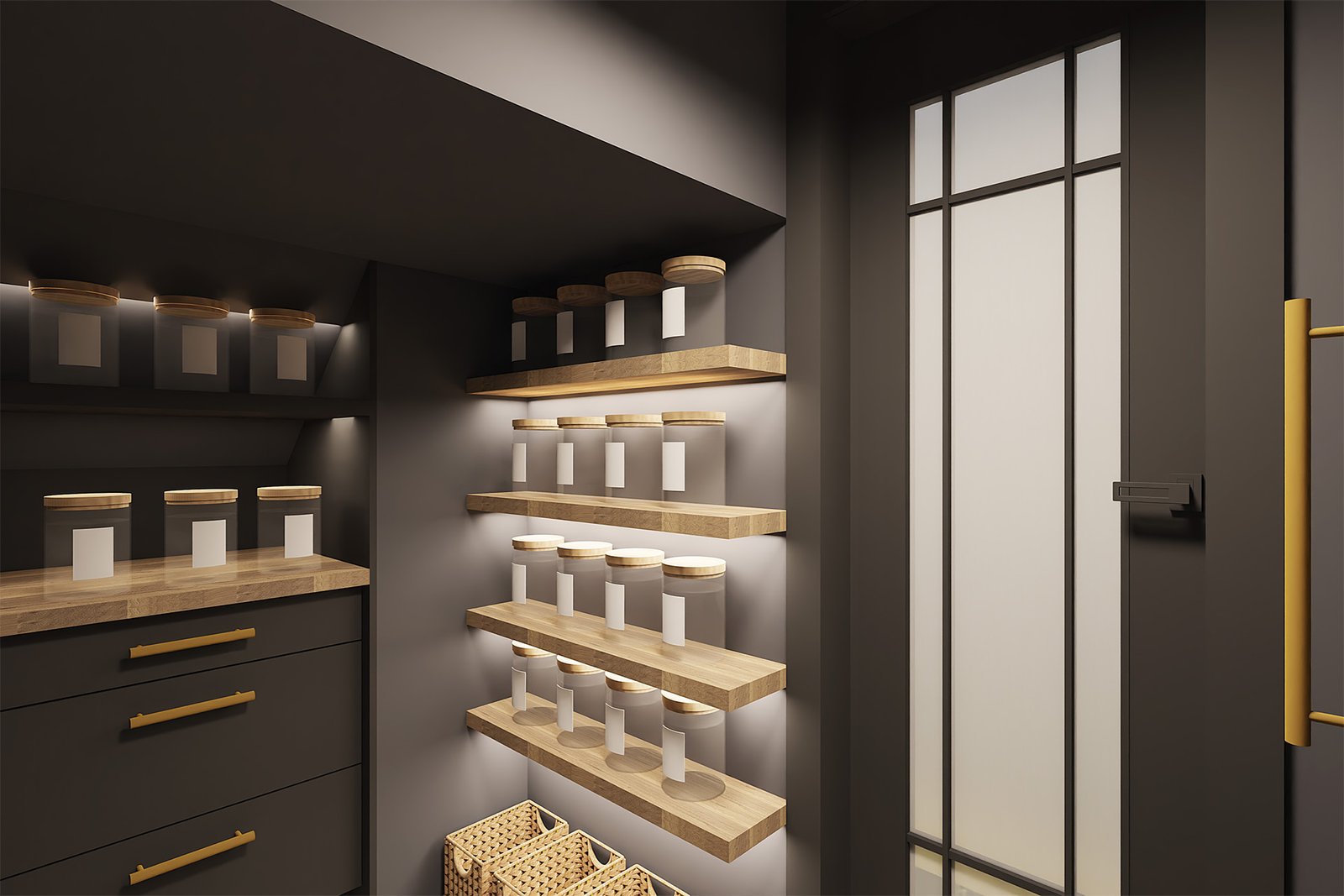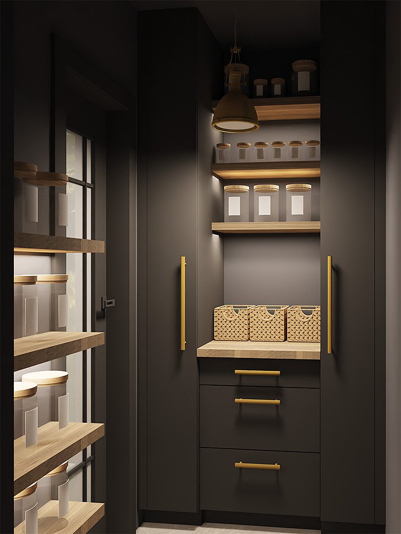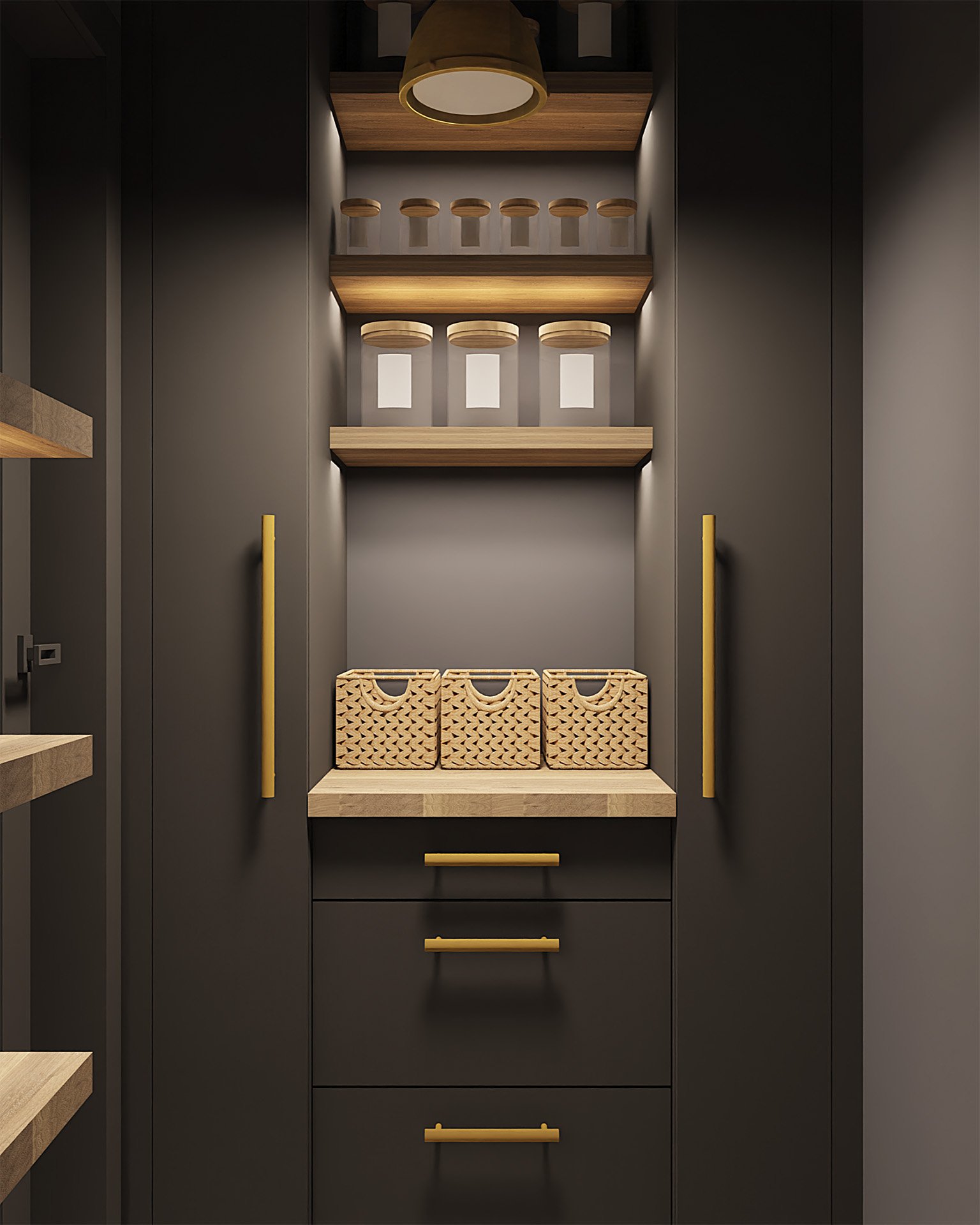 Spiżarnia, mimo ograniczonego metrażu, została zaprojektowana z pełnym wykorzystaniem przestrzeni: dwa wysokie cargo, maksymalna liczba półek, akcenty z naturalnego dębu i kolor drenching na wszystkich ścianach.