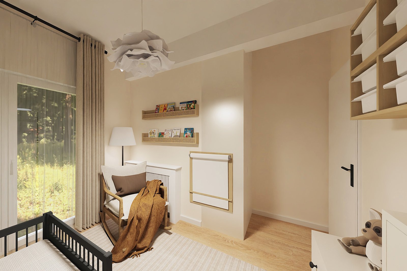 Zaprojektowałam przestrzeń elastycznie — na teraz i na później. Aktualnie pokój pomieścił dwa łóżeczka i całą potrzebną funkcjonalność, ale docelowym rozwiązaniem jest rozkładane łóżko, które zapewni komfort przy minimalnej utracie przestrzeni.