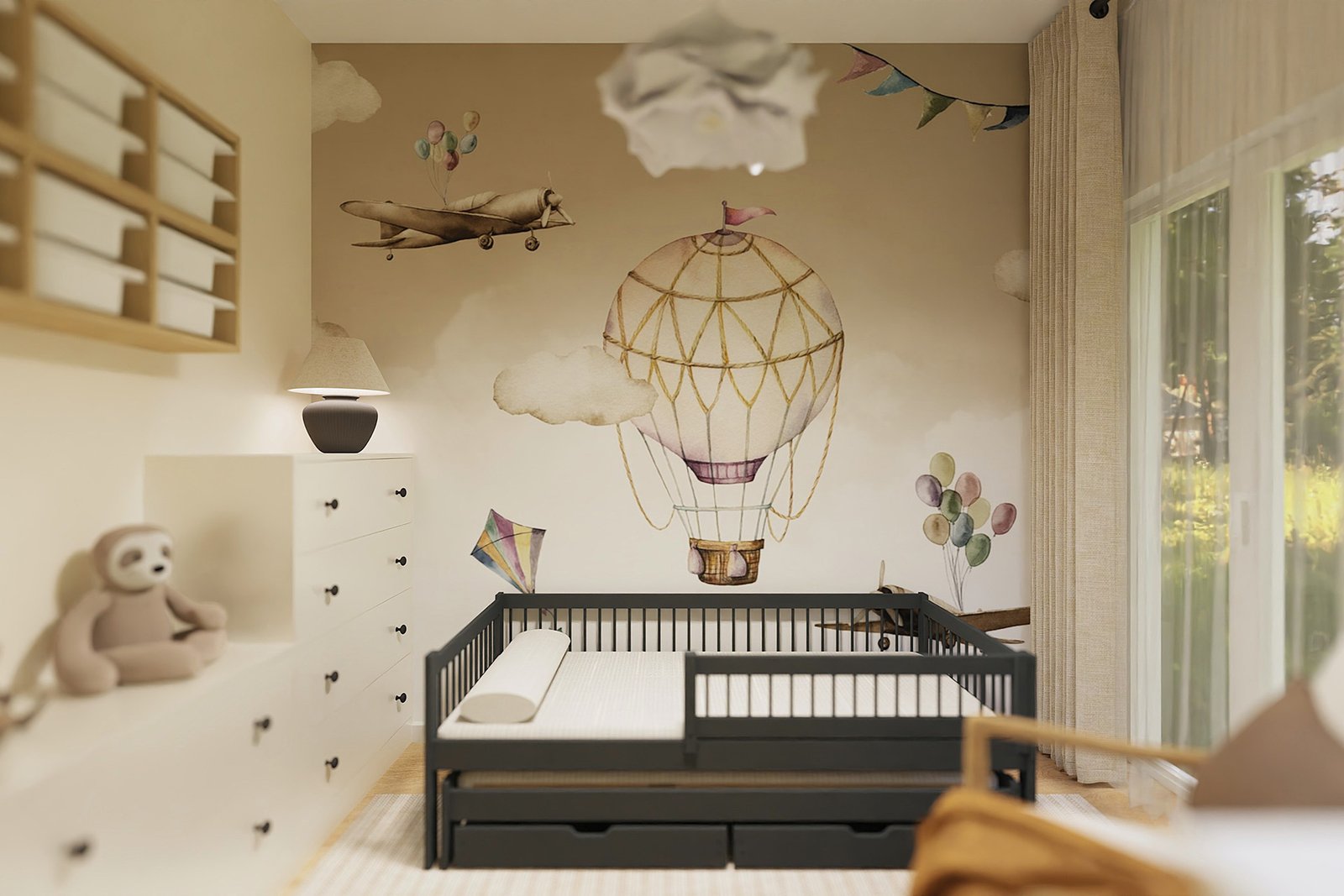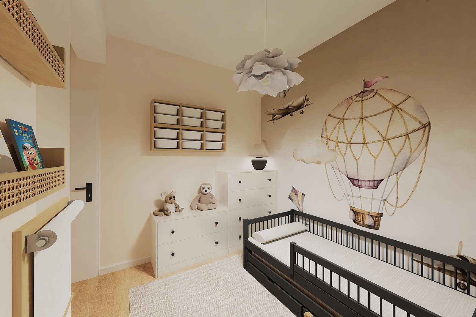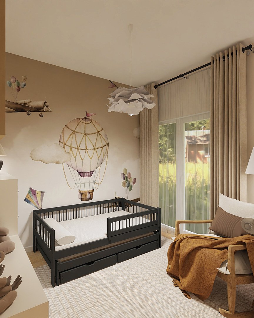 Estetykę pokoju zbudowałam wokół tapety z balonem — lekka, symboliczna, idealna dla przestrzeni marzeń. Delikatny żyrandol przypominający chmurkę, neutralne beże i subtelne faktury sprawiają, że wnętrze jest spokojne, ale nie nudne. Do tego: kreatywny kącik do zabawy i bujany fotel — idealny do czytania na dobranoc.